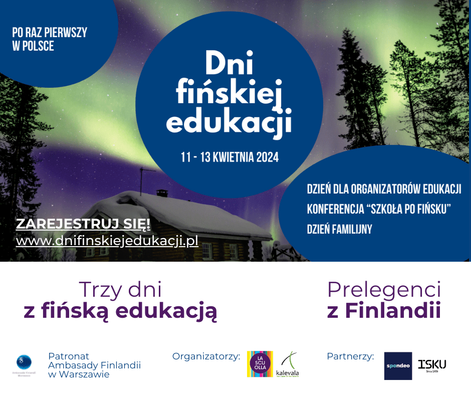 Serdeczne dzięki Uczestnikom i prelegentom konferencji „Szkoła po fińsku. 6 aspektów fińskiej edukacji” (12 kwietnia 2024). A także współorganizatorowi: fińskiej wiosce Kalevala, partnerom: Spondeo i Isku Polska oraz patronującej nam Ambasadzie Finlandii w Warszawie.